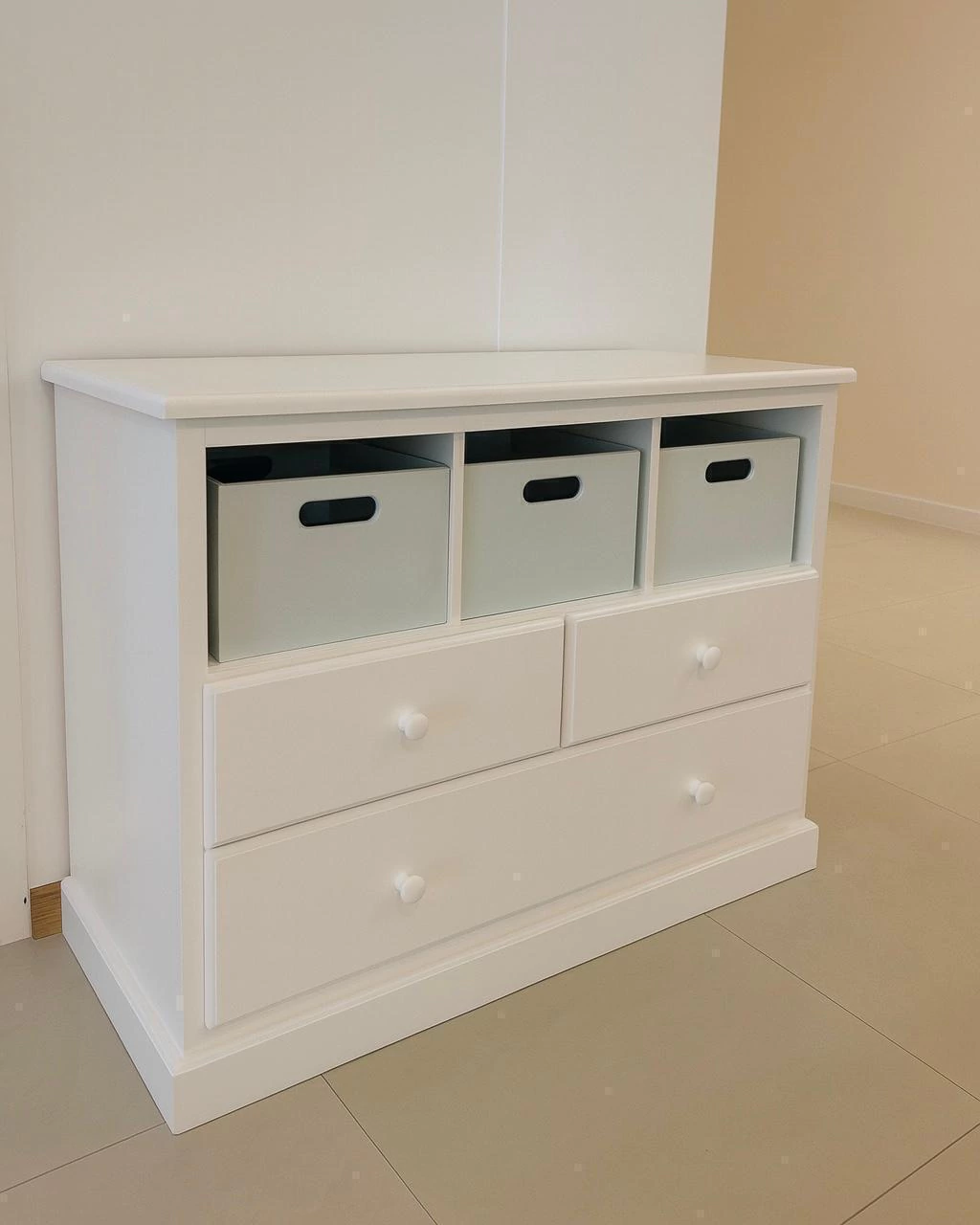 Un diseño renovado para un clásico mueble del cuarto. Los tres espacios superiores permiten incorporar cajas cuadradas, agregando color y personalidad. Los tres cajones tienen gran capacidad, con tiradores redondos y guías que aseguran un deslizamiento suave y cómodo.