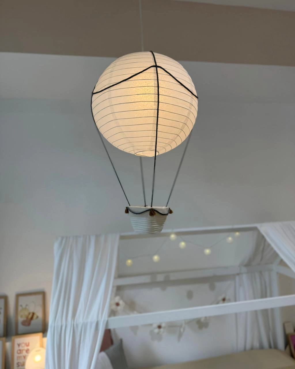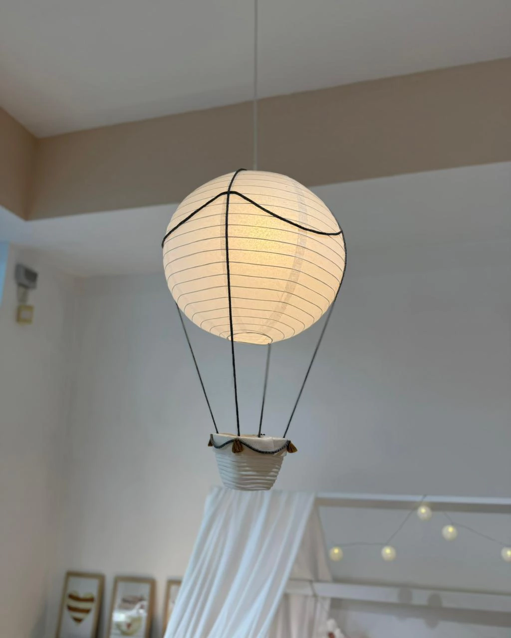 Lámpara colgante con diseño tipo globo aerostático, realizada en acabado natural. Su forma esférica aporta calidez y un estilo lúdico que transforma cualquier espacio infantil en un ambiente mágico y acogedor.