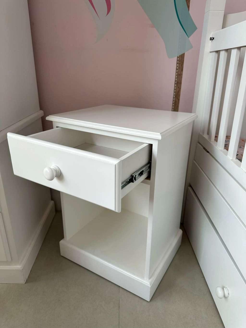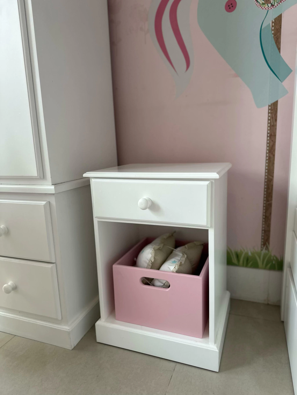 La más femenina de nuestras mesas de luz. Se destaca por sus delicados detalles moldurados en tapa, zócalo y cajón. Incluye un cajón superior y un amplio espacio inferior que puede complementarse con cajas cuadradas para sumar color y funcionalidad.